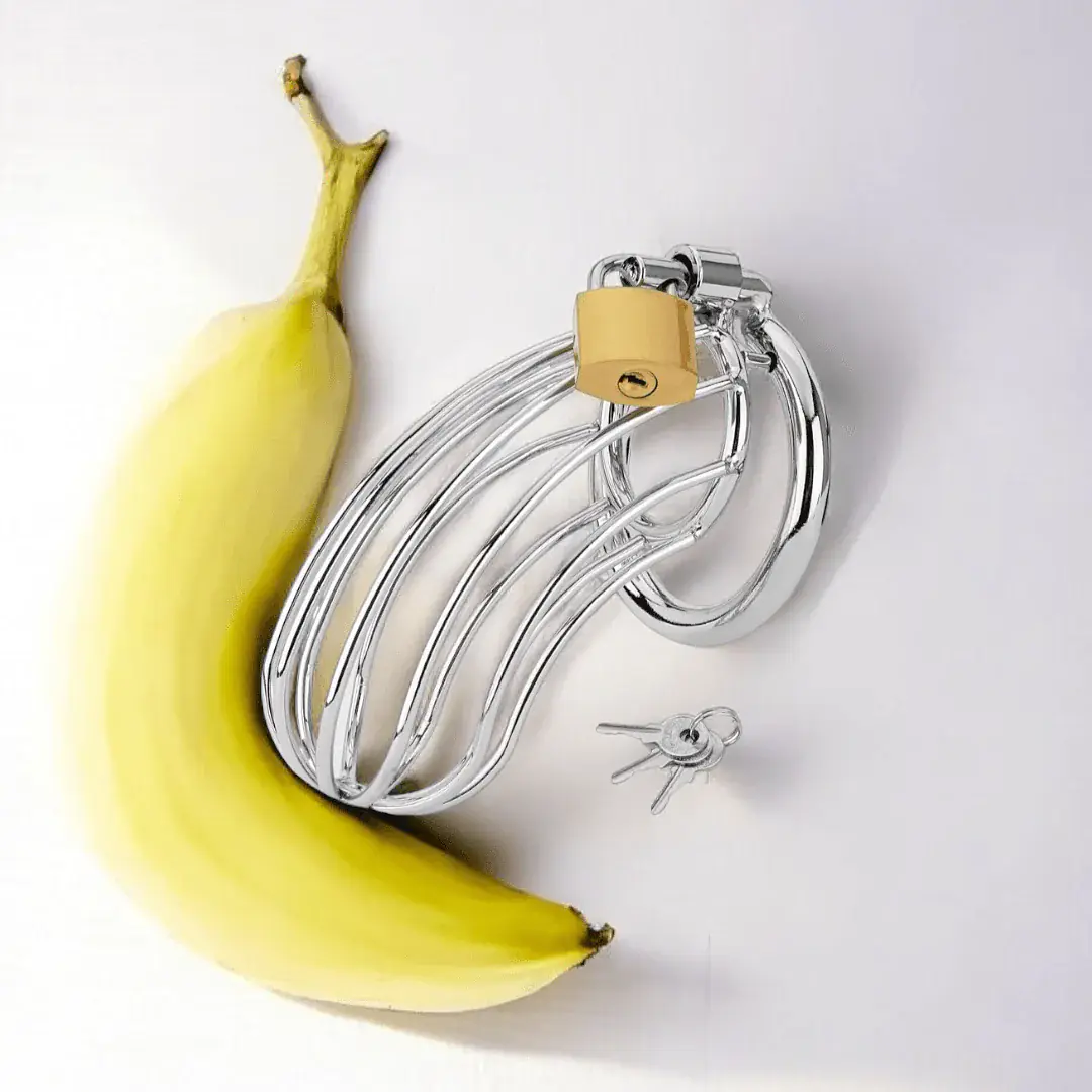 The metal pins attached to the bridge piece slide smoothly through the holes in the provided steel ring, which fits securely behind the body. Once in place, the flaccid organ is positioned inside the cage, and the centre pin is secured using the metal spacer. The padlock is then threaded through the middle pin’s open hole and locked for a firm and stable fit.